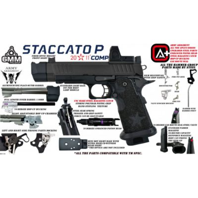 The Staccato Licensed P COMP (New Version) Gas Blowback Airsoft Pistol offers an authentic airsoft experience crafted for precision and realism. This airsoft replica reflects the high standards set by its real steel counterpart, making it ideal for players seeking performance.