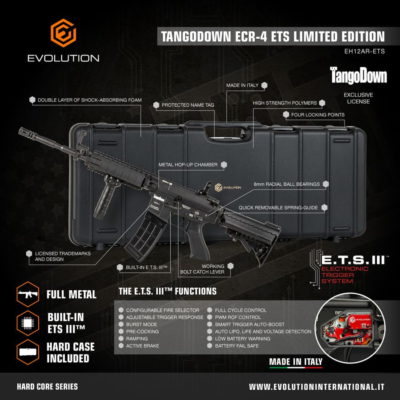The Evolution Tango Down ECR-4 ETS Mosfet Limited Edition with Hard Case provides an authentic design and construction. The product showcases a full metal body, adorned with elegant Tango Down licence markings. Users can appreciate its unique serial number and the quality of its high-grade internals.