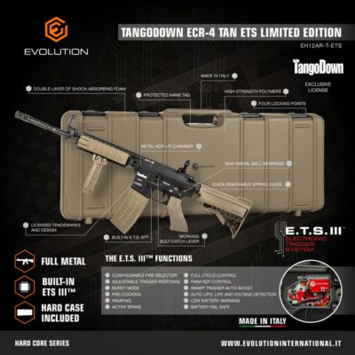 The Evolution Tango Down ECR-5 ETS Mosfet Limited Edition with Hard Case in Tan represents a premium choice for airsoft players. This AEG features a full metal body, ensuring durability and realism. The robust design includes a unique serial number, showcasing its limited edition status.