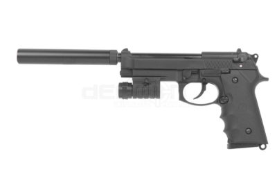 The KJWorks LS9 / M9 GBBP with Suppressor in black is a high-performance airsoft pistol designed for precision and reliability. This model features a full metal design, ensuring durability while maintaining a realistic weight.