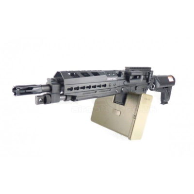The Krytac Trident MkII LMG Enhanced provides exceptional firepower combined with the agility of a traditional AR platform. This airsoft machine gun features a box magazine and is compatible with standard M4 and M16 magazines, enhancing versatility.