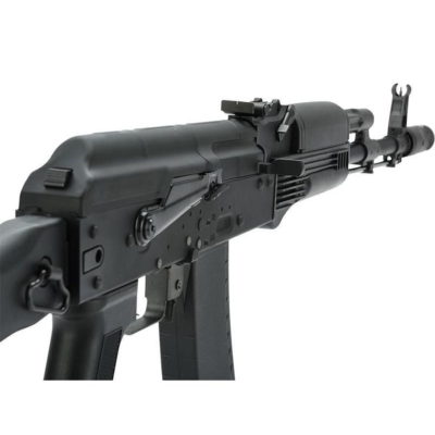 The KWA AKR-74M AEG3 in black is a high-performance airsoft rifle designed for precision and durability. This model features electric blowback functionality, providing a realistic shooting sensation with each trigger pull. The one-piece full metal alloy construction ensures robust performance and longevity through intensive use.