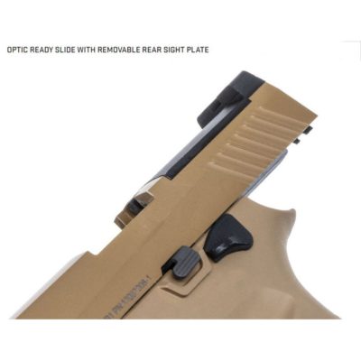 The SIG Air x SIG Sauer ProForce M17 Co2 Blowback Pistol in tan embodies precision and authenticity. Its optic ready slide includes a removable rear sight plate, providing versatility for aiming. The design allows for field stripping, mimicking the weight and balance of the real M17, offering an engaging operation.