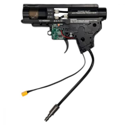 Engineered for competitive airsoft, it replaces standard AEG internals with a regulated HPA solution — enabling tighter shot groupings and faster cycling due to its solenoid-powered 11.1V LiPo operation.
