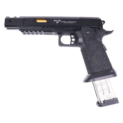 The Jag Precision x Taran Tactical International Combat Master ALPHA Hi-Capa GBBP (R601-3 – Black) is a high-performing air pistol designed for precision and speed. It features an innovative design with optic mounts that allow for enhanced accuracy in fast-paced scenarios. The non-tilting barrel ensures smooth cycling, making follow-up shots quick and consistent.