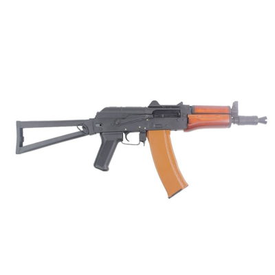 The Double Bell AKS-74U Stubby Airsoft Rifle AEG is a robust choice for airsoft players. This rifle features a primarily metal construction, ensuring durability during intense gameplay. The genuine wood upper handguard adds an elegant touch, while the polymer pistol grip offers comfort and control.