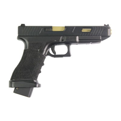 The Double Bell 34 Baba Yaga Series Gas Blowback Pistol offers a striking recreation of the iconic Glock 34 from the John Wick films. This gas blowback pistol features a durable metal slide and barrel paired with a robust polymer frame, ensuring both reliability and aesthetic appeal. The fibre optic front sight aids in quick target acquisition.