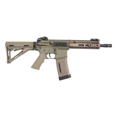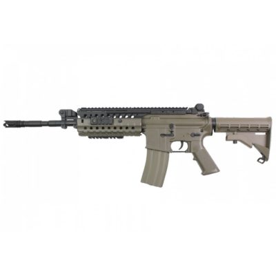 The Double Bell M416 Keymod AEG (Short – Tan) offers a robust construction with a full metal body and polymer components. This rifle features a V2 compatibility, allowing for seamless upgrades and customisation.