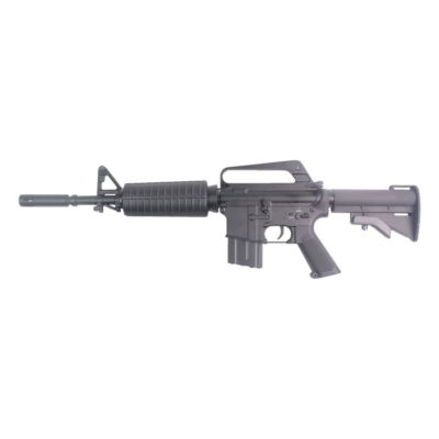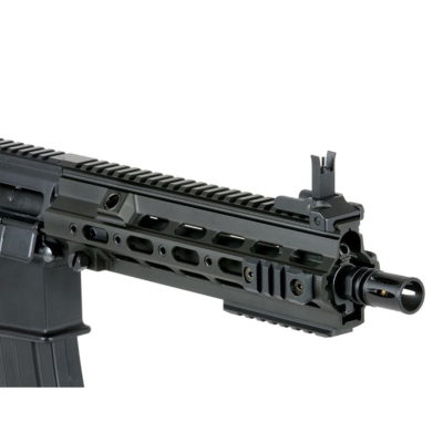A quad-rail RIS handguard allows attachment of tactical accessories, which enhances field adaptability. The removable flash hider reveals a 14mm CCW thread, permitting suppressor installation—making this carbine ideal for versatile skirmish roles.