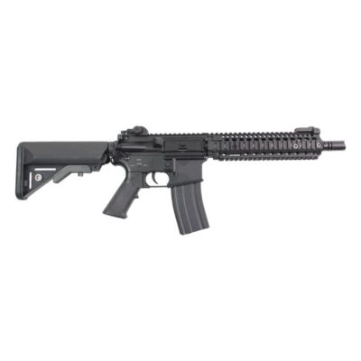 The Double Bell MK18 AEG Full Metal Black offers a high-performance airsoft rifle for discerning players. This model features an 8mm bearing gearbox, ensuring smooth operation and reliability. The adjustable hop-up unit allows for precision shooting, while the long shaft motor delivers consistent power.