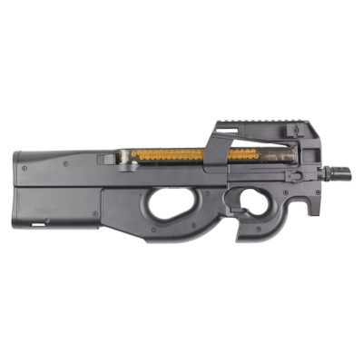 The Double Bell D90 Black is a distinctive submachine gun designed for various shooting scenarios. Constructed entirely from polymer, this model features a mid-cap magazine filled with faux bullets for realistic appeal. Its top and side rails enable users to attach a variety of accessories, enhancing usability and versatility.