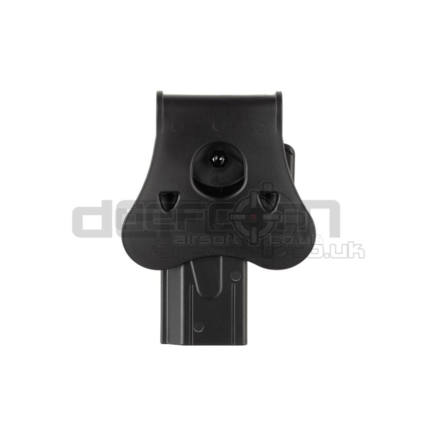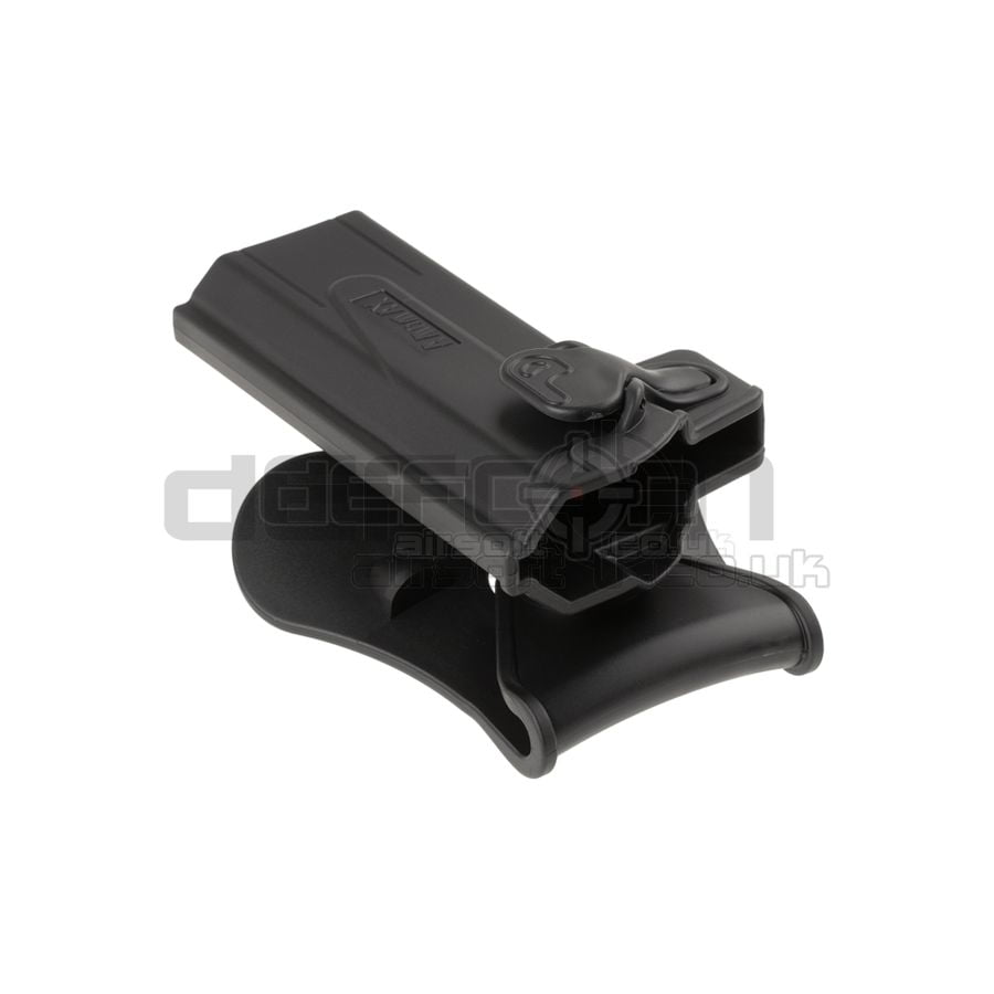Amomax is a sub-division of Cytac Holsters who produce real steel weapon holster platforms for military and law enforcement agencies worldwide. This is a great SERPA style holster with a rugged design to keep your pistol safe and secure. These holsters lock into the trigger guard of the respective pistol which you can then swiftly release with the sprung paddle on the side. They come with an over-the-waistband paddle attachment as stock but there are other attachments available such as belt clip, MOLLE, and drop leg platform. Paddle and belt clip carry holster on the waistband.