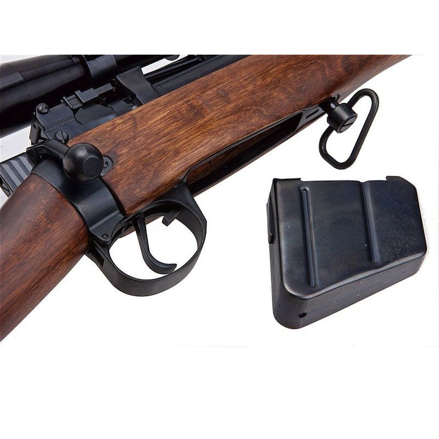 The Ares Classic Line L42A1 with Scope and Mount replicates the iconic British sniper rifle from the Falkland Wars. This model showcases robust stainless steel construction with a QPQ finish, ensuring durability and an authentic look. The high-quality wood stock adds to its realistic feel, providing both style and comfort.