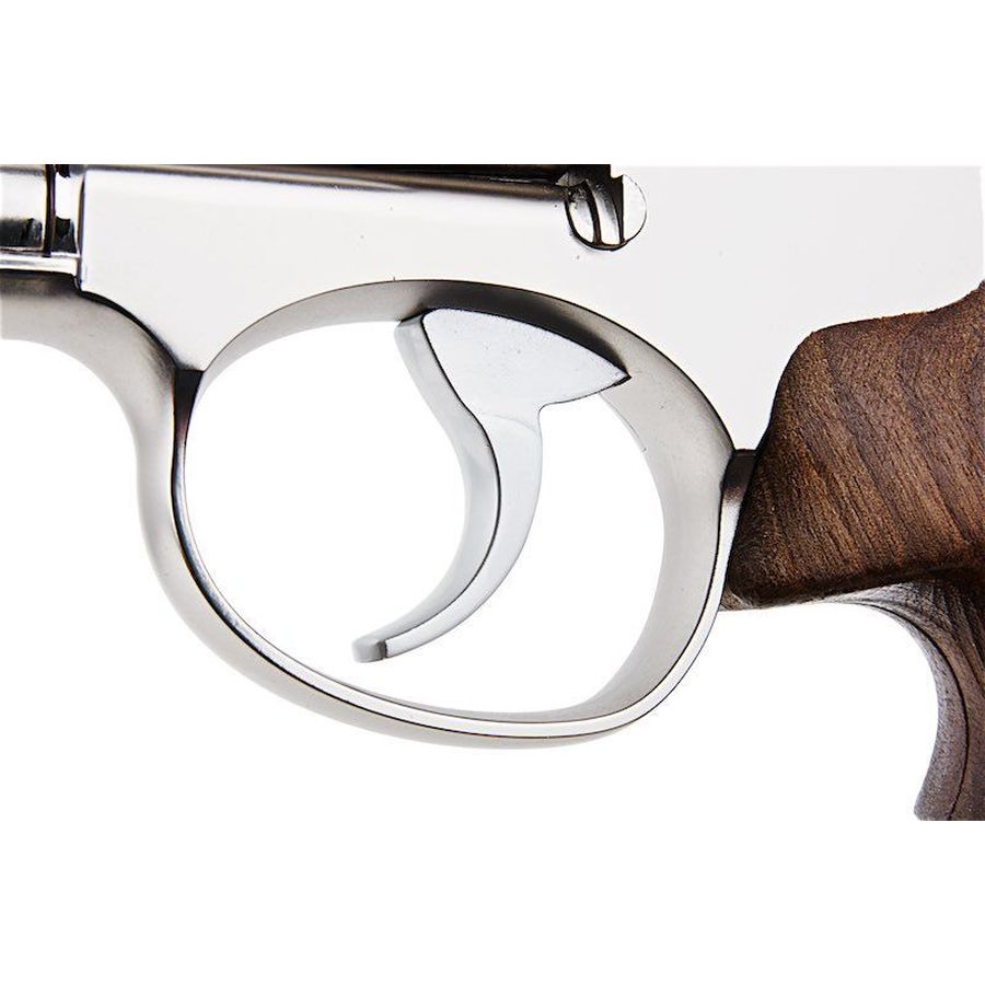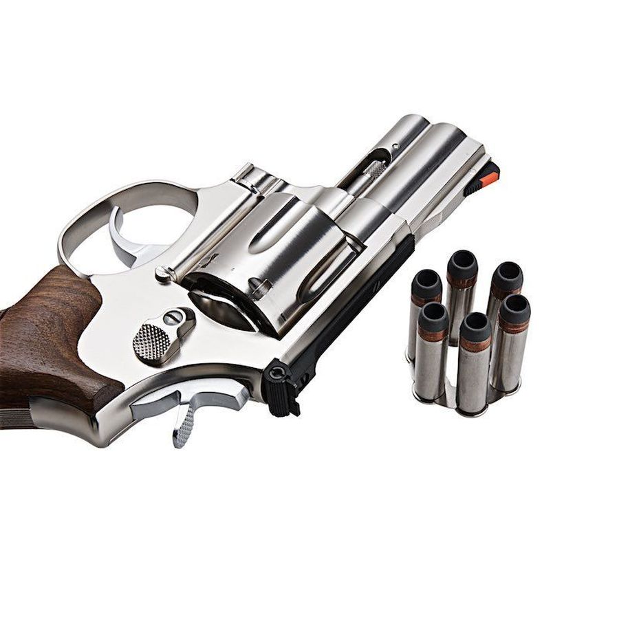 The Ares S&W 686 2-inch CO2 Revolver is a full metal airsoft revolver styled after the iconic Smith & Wesson Model 686, delivering authentic snub-nose realism and dependable CO2 power. Zinc alloy construction + electroplated silver finish + walnut grips create true-to-life weight and balance, therefore enhancing handling and visual authenticity.