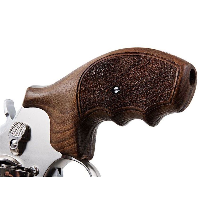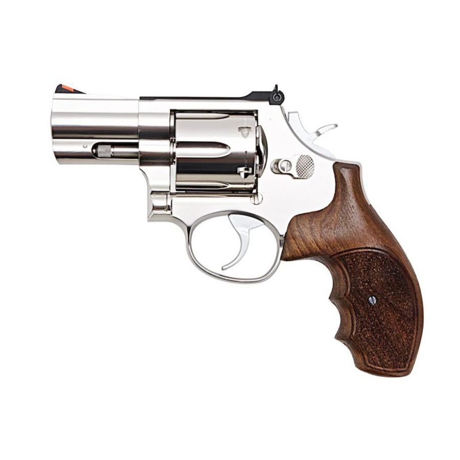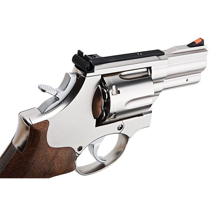 Modelled on the legendary Smith & Wesson Model 686 L-Frame “wheel gun”, this CO2 airsoft revolver replicates the iconic .357 Magnum profile with striking precision. The electroplated stainless-steel effect finish enhances durability, whilst the genuine walnut wood grips reinforce its authentic character, since both materials replicate the weight and feel of the original firearm.