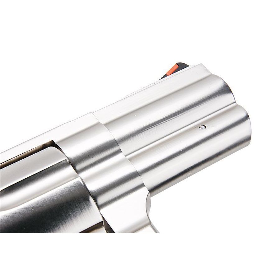 This non-blowback airsoft revolver operates in both single and double action with a six-round shell capacity. The electroplated silver finish completes its premium presentation, making it suitable for skirmish use, target practice or collection display.