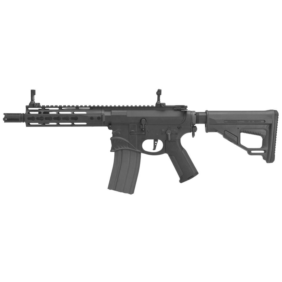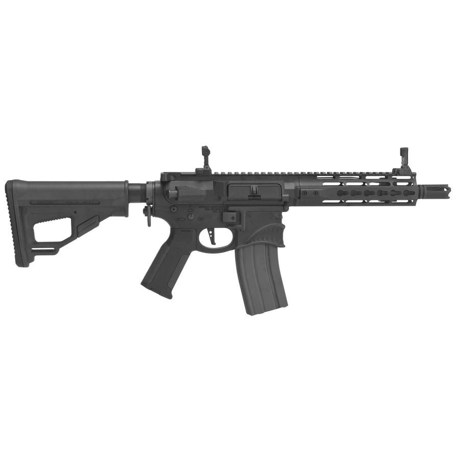 The Ares x Sharp Bros. Pro M4 7” in black delivers a robust airsoft rifle experience. This high-performance rifle features metal upper and lower receivers, ensuring durability and reliability during use. The reinforced metal gearbox supports a full steel gear set, allowing for efficient operation across various firing modes including safe, semi, and full auto.