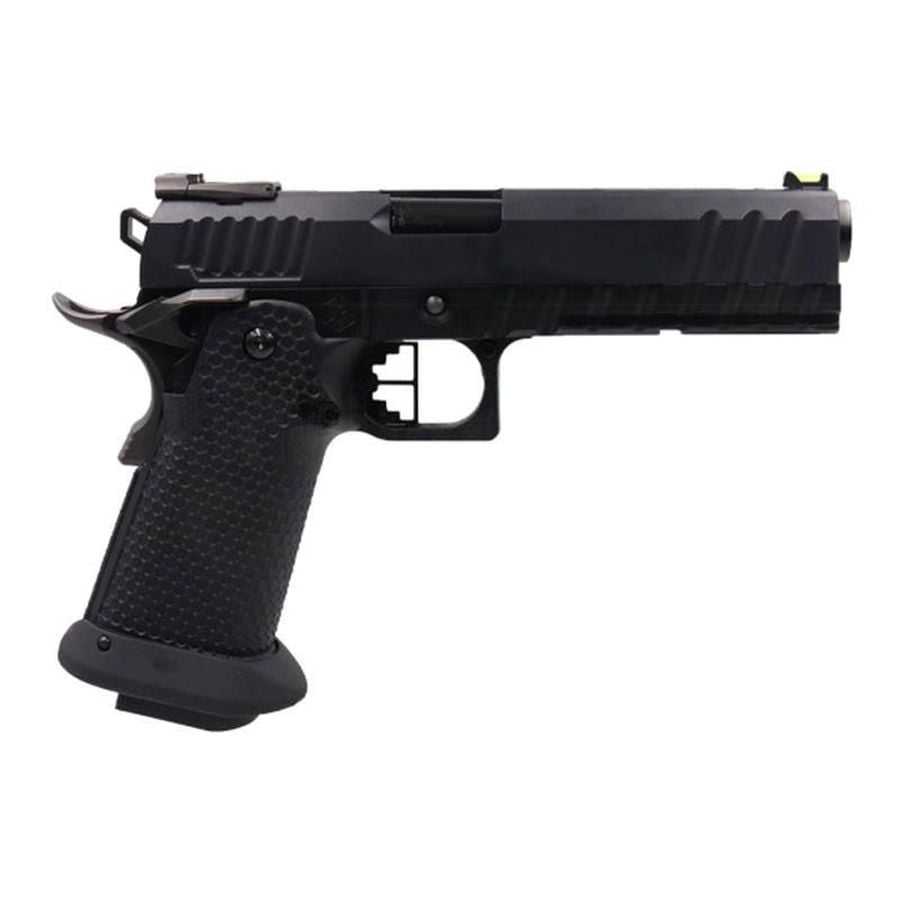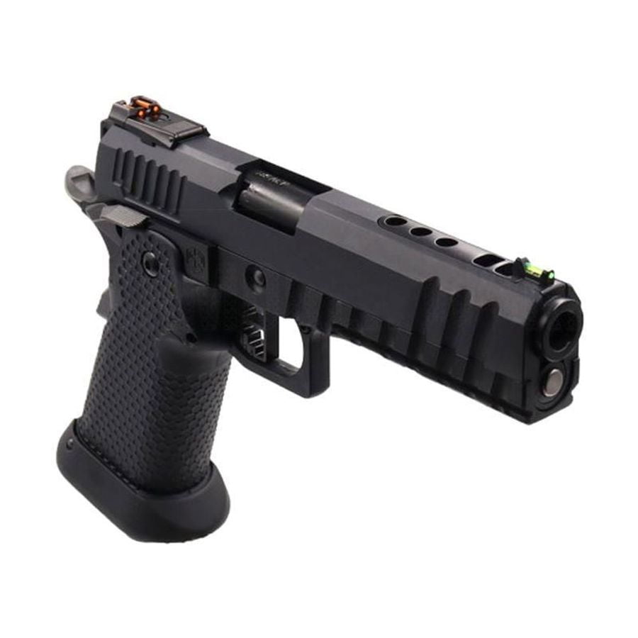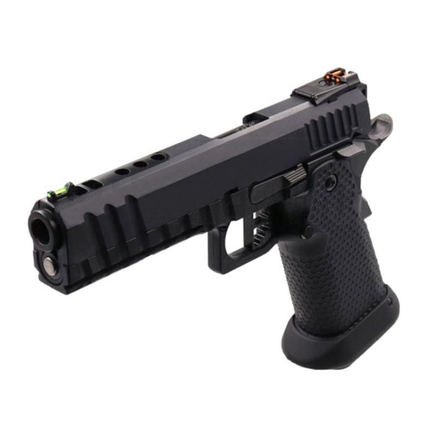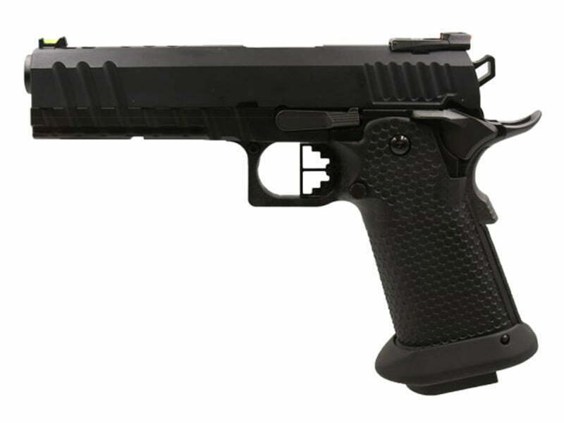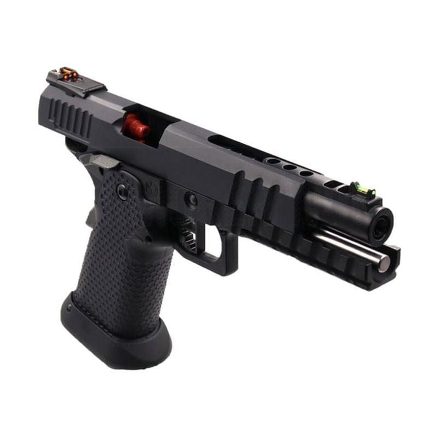 The Armorer Works Custom Black Ace Hi-Capa GBBP features a full metal slide and upper frame, ensuring durability and reliability. The enlarged competition style grip with a honeycomb pattern improves handling and comfort during use. An enlarged magwell flare aids in rapid reloading, while the ambidextrous safety and functioning beaver tail safety enhance operational safety.