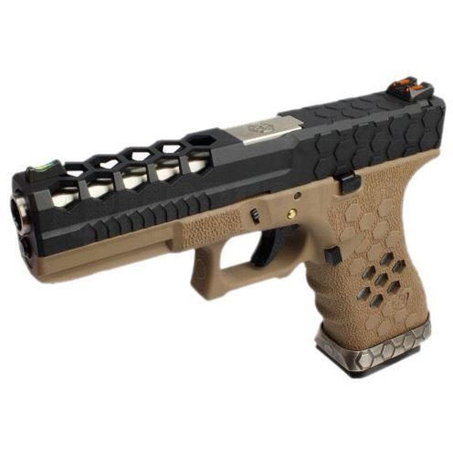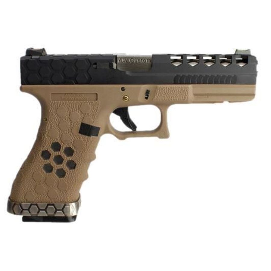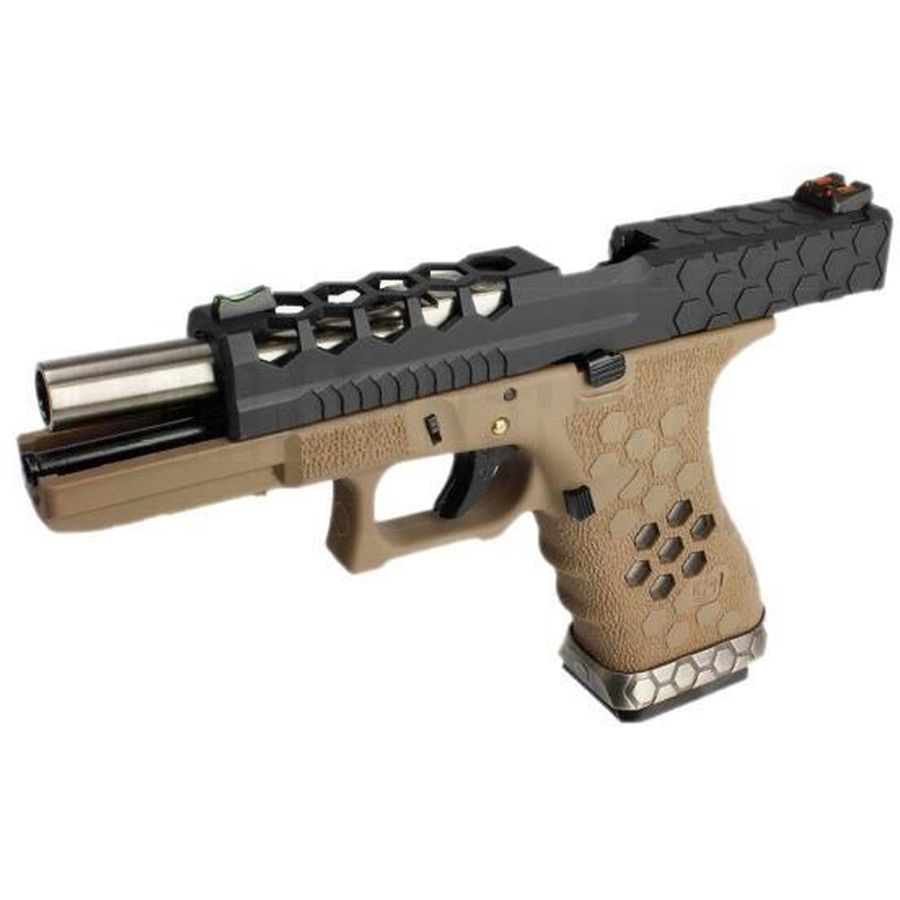 Armorer Works presents the Custom Hex-Cut (AW-VX0111 – Tan) pistol, a sophisticated choice for enthusiasts of tactical shooting and skirmishing. This model showcases the innovative *lightweight hex-cut slide*, which reduces the overall weight while providing a secure grip.