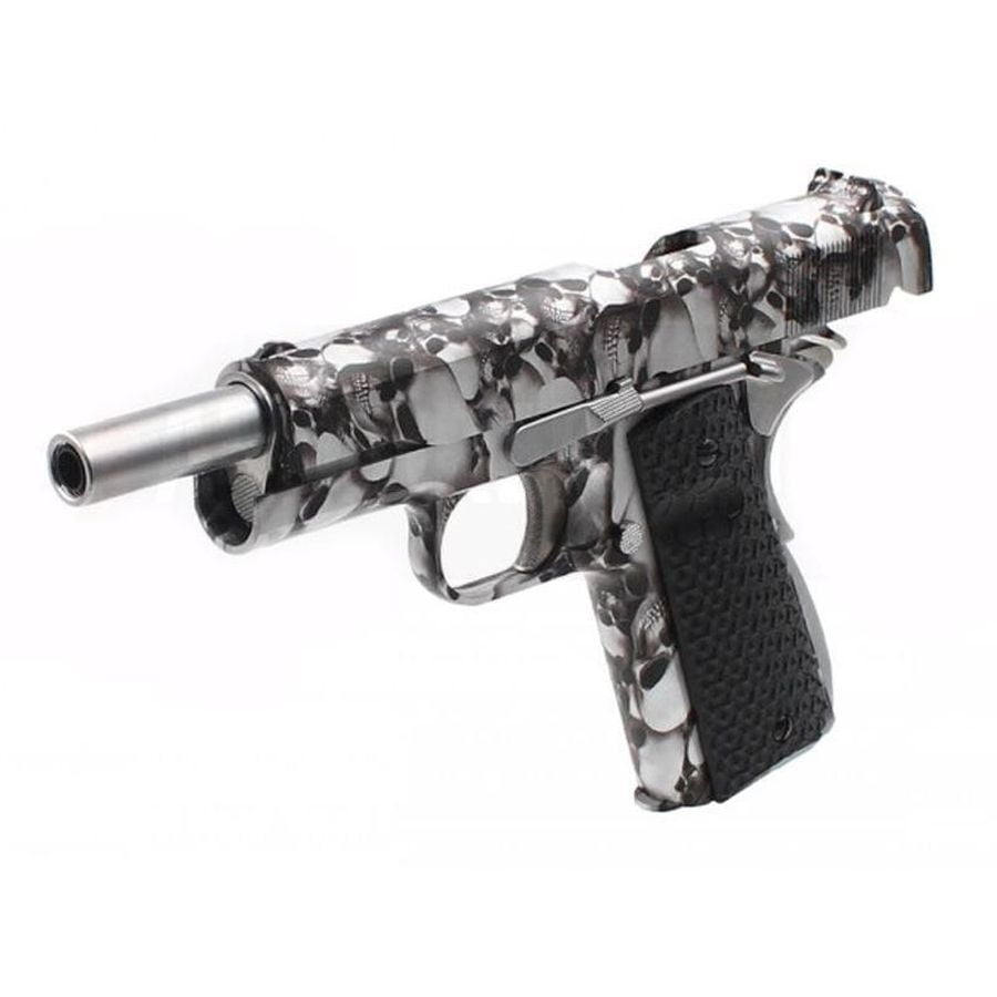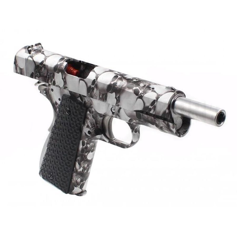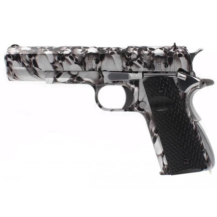 The Armorer Works Custom Skull 1911 (AW-AW-NE2101) is a striking addition to any collection. This pistol features a full metal frame and slide, which provides a realistic look and feel during use. The textured honeycomb grip panels ensure a firm hold.