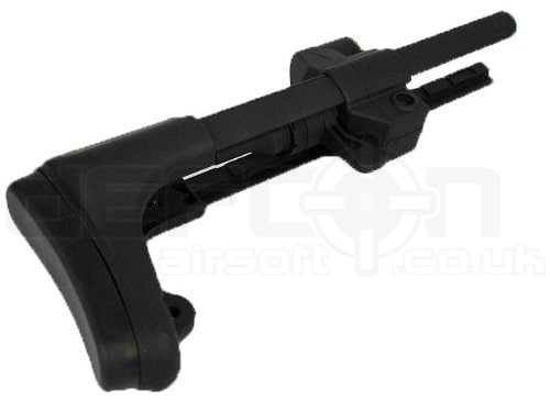 The Cyma MP5-style Retractable Stock offers versatile functionality for airsoft players. This stock features a durable construction, combining nylon fibre and metal for strength and longevity. Its four-position stop allows for adjustable length, catering to different combat scenarios. The rubber buttpad provides comfort during extensive gameplay.