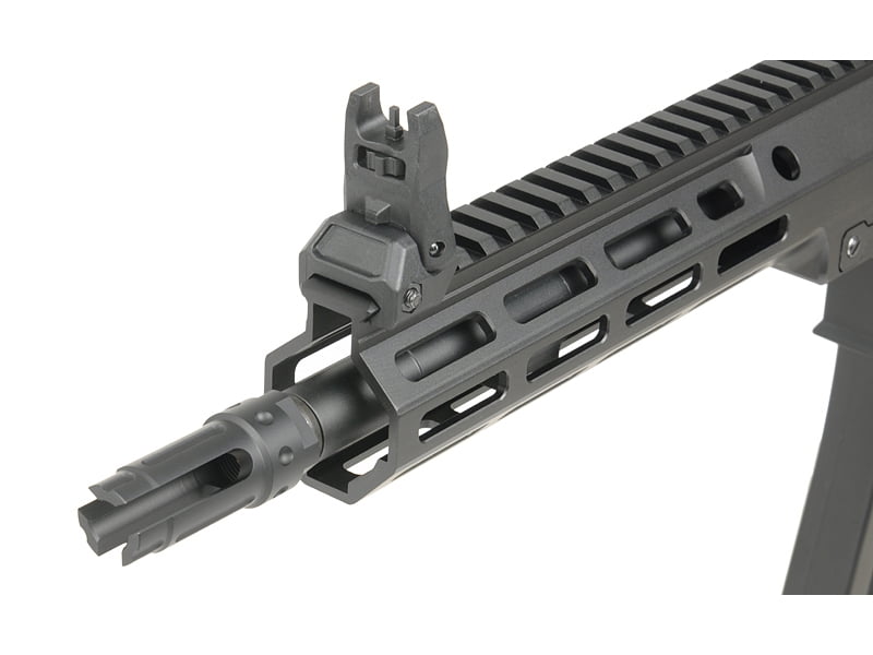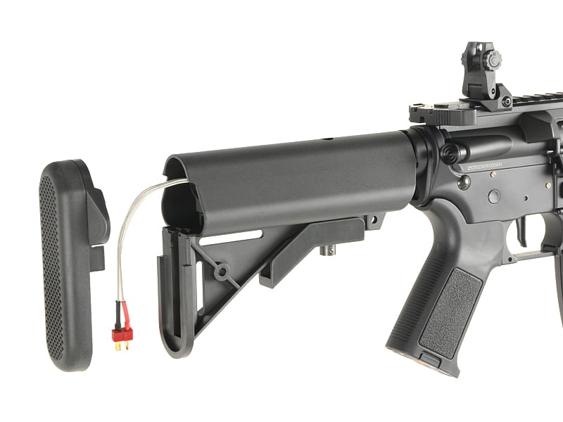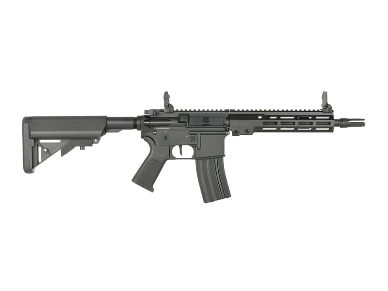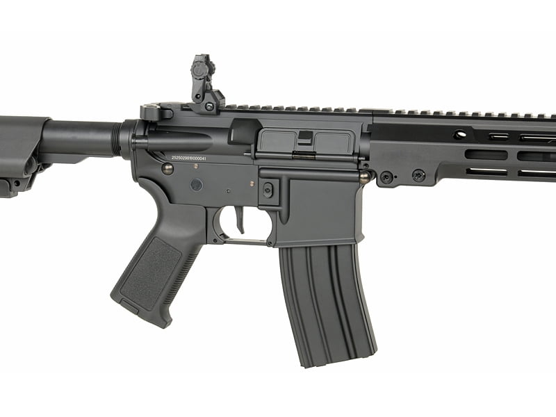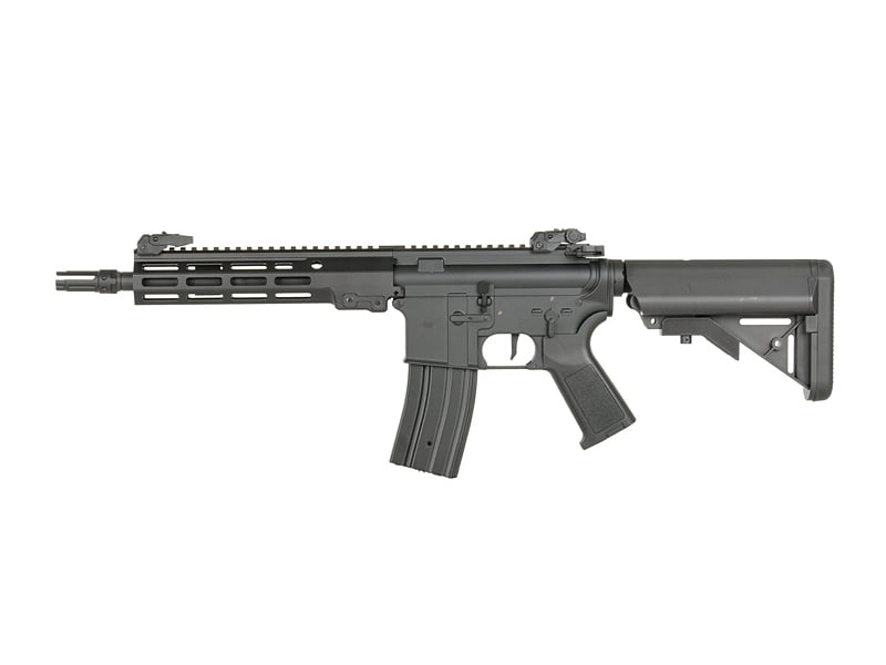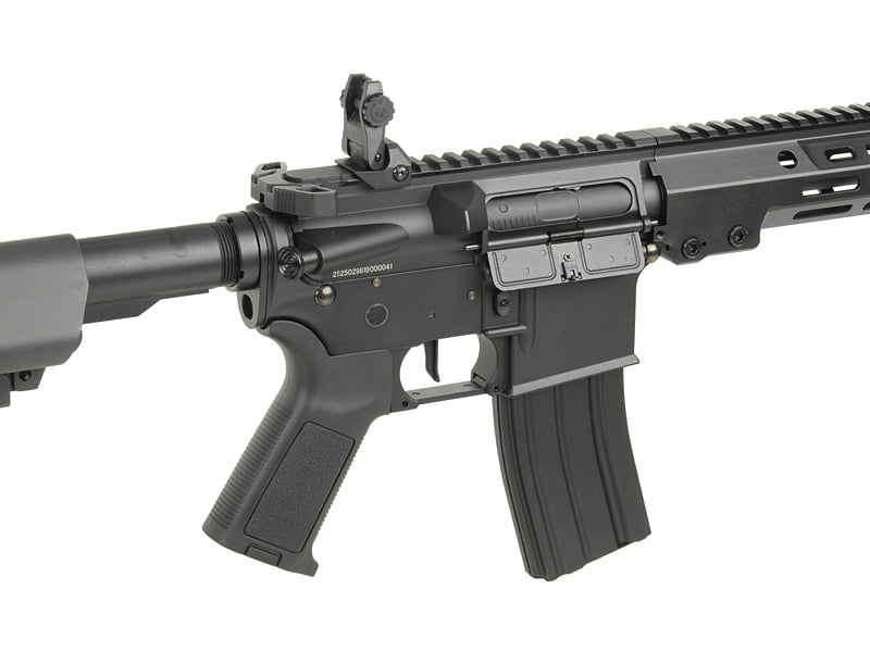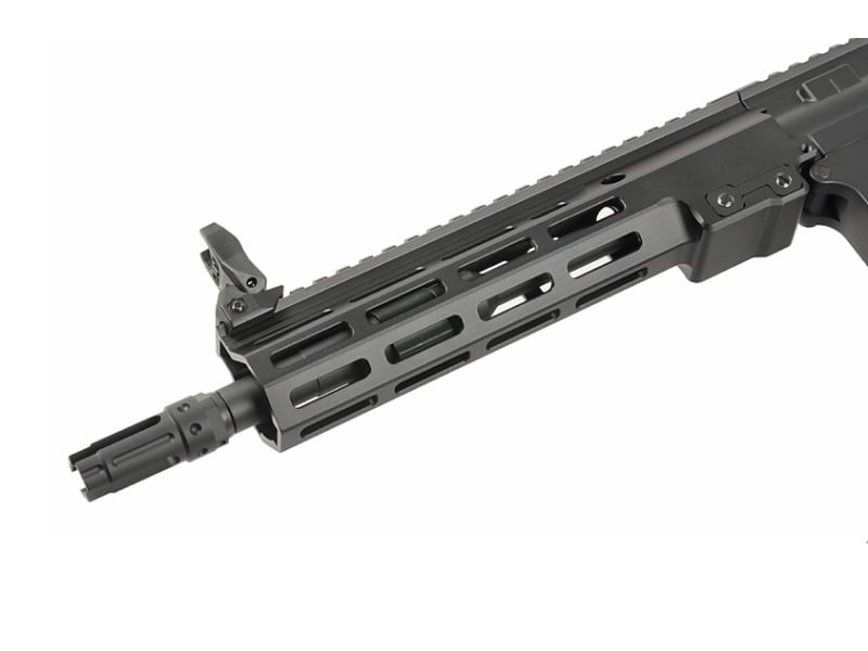 This Double Eagle M4 AEGs combine excellent external design with solid and reliable internals. This paricular rifle comes with 20mm mounted flip up iron sights, blade trigger, unique receiver design, multi position stock, M-LOK rail and unique flash hider. The rifle has a 14mm CCW threaded muzzle. The rifle has the Double Eagle V2 gearbox with EFCS.