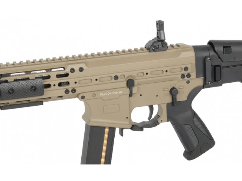 Mechanism of Gearbox v2 with a quick spring change system mounted on 8mm steel ball bearings and rotary hopup. In addition, as a standard, these replicas are equipped with a Falcon electronic control system with programmable fire mode (Double Shot on SEMI mode or 1-5 Round Burst on AUTO mode), trigger sensitivity adjustment (3 modes) and motor and battery protection.