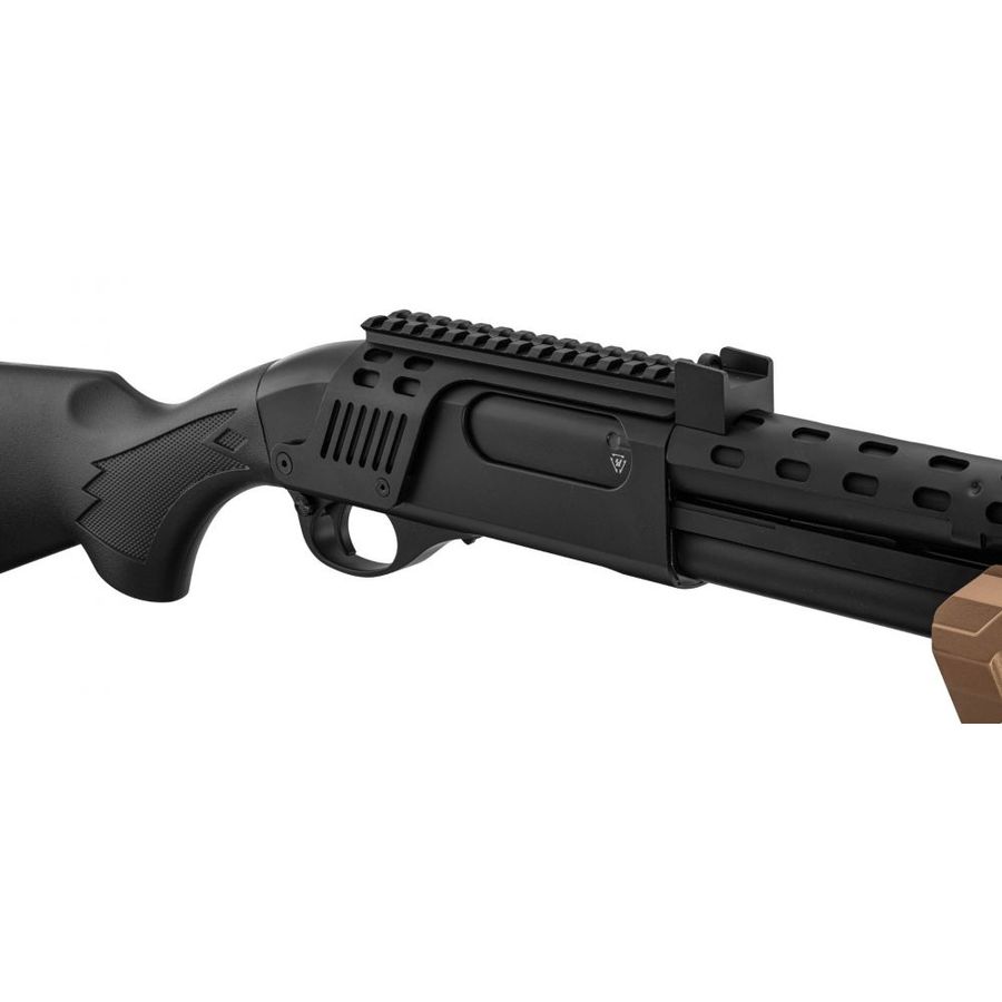 With a modular design, railed receiver, and aluminium M-Lok handguard, the M870 allows easy customisation and accessory attachment, which improves handling and versatility. Its functional stock, pistol grip, and laser-engraved markings enhance realism and operational efficiency, making it a top-tier airsoft pump action shotgun in the UK market.