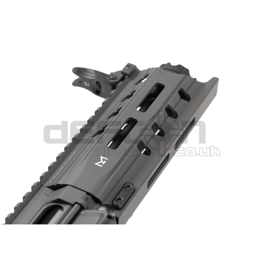 The G&G AEG ARP 556 Full Metal with ETU in Battleship Grey offers a distinctive option for airsoft players. This rifle stands out from typical airsoft M4 variants with its unique design.