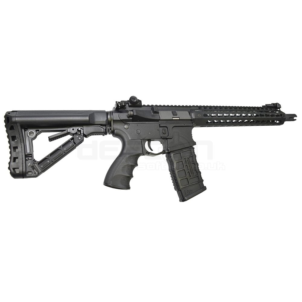 The newest evolution of the G&G Combat Machine line up takes all the standard features that everyone has come to know and respect from the Combat Machine line and improves upon it by offering upgrades and modifications that are never seen at such a low price point, and yet done to such a high level of quality. The CM16 SRXL offers an entirely redesigned polymer receiver, borrowing from the ever popular billet style that has been seen more and more in the firearms world. Other improvements include and ambidextrous magazine release, ambidextrous mock charging handle, 12″ metal keymod handguard and a selector switch with a heavy duty detent that gives the user tactile feedback when changing fire modes. While the CM16 SRXL knocks other AEGs in its price range out with its agressive styling, it’s whats on the inside that counts most. Installed from the factory is a MOSFET, allowing the user to use LiPo batteries without worrying about damaging the gun and a programmable fire control which allows the shooter to choose either full-auto fire , or three round burst fire modes. Loaded with features and good looks the CM16 SRXL is an excellent choice for any airsofter who is in the market for a gun that has all of the latest features and technology.