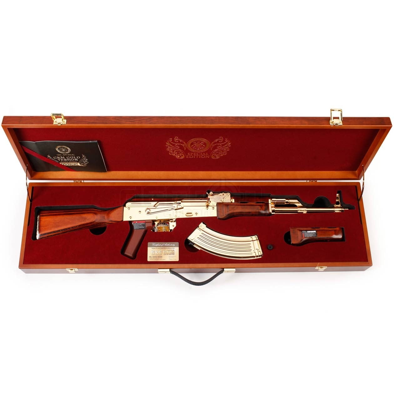 The G&G Limited Edition Gold Plated GKM is as fine and classy as it gets. This deluxe AEG is plated in 22 carat gold and furnished with beautifully stained wood. The masterpiece you see before you comes in a gorgeous expertly crafted velvet lined wood case which in itself is a masterpiece. Internally this AEG features G&Gs tried and true 8mm Bearing Electric Blowback Gearbox with a high torque motor.