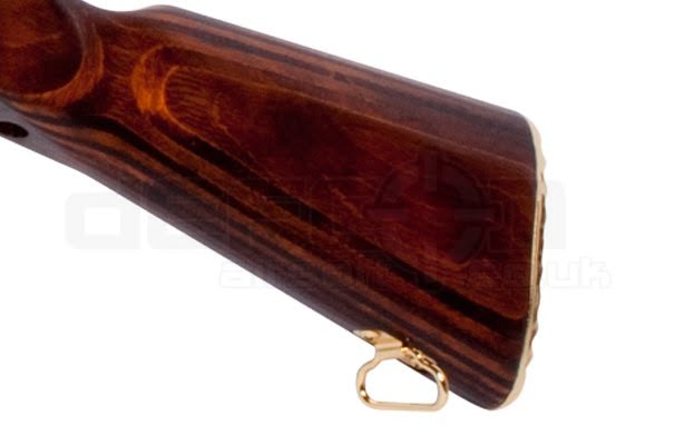 The G&G Limited Edition Gold Plated AK47 GKM EBB Rifle w/ Real Wood Furniture stands out as a remarkable replica. This AEG features exquisite 22 carat gold plating that enhances its luxurious appeal. It is fitted with expertly crafted real wood furniture, ensuring a stunning visual presentation.