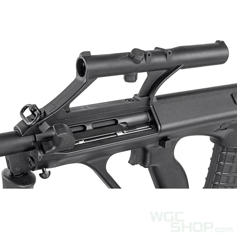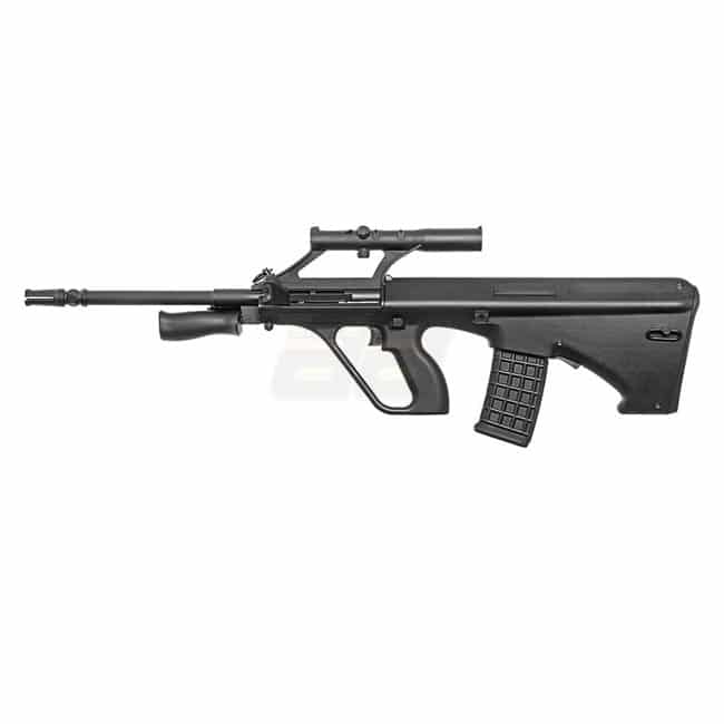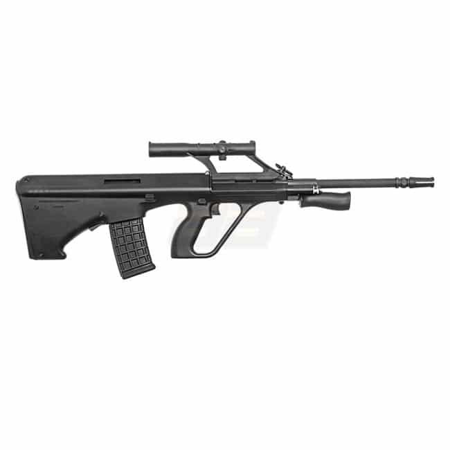 GHK, one of the industry leaders in the development and production of gas blowback Airsoft rifles, has now added the lauded, iconic AUG rifle to their stable of extremely realistic high performance line-up. A detailed homage to the AUG, the GHK AUG features a body made from heavy duty polymer, very similar to the materials used in the production of the actual firearm. All the hallmarks of the traditional AUG design have been included. The integrated carry handle features a crystal clear 1.5x magnified optic, topped with a set of traditional open iron sights. The forward vertical grip folds up and out of the way when not in use and gives the rifle a snag-free and more streamlined design. The bolt and firing mechanism are all in their proper place, towards the rear of the rifle, behind the shooters hand, allowing for the use of a 20 inch barrel on what is otherwise a very compact system.