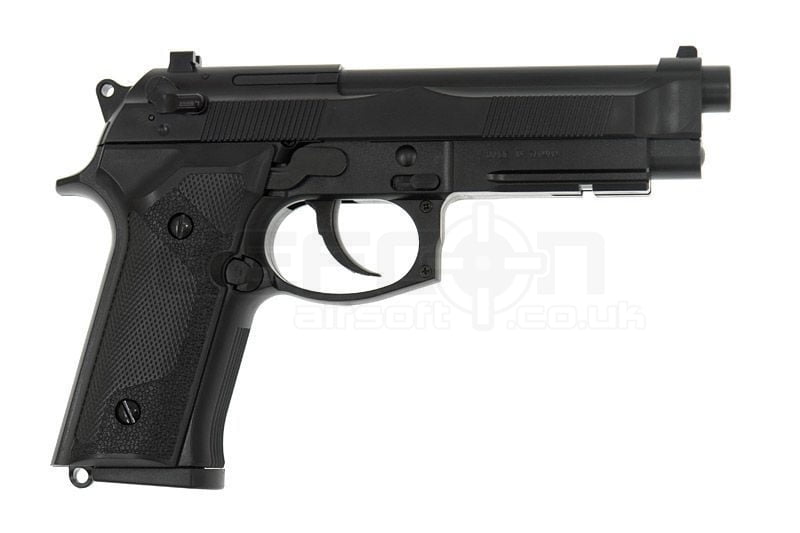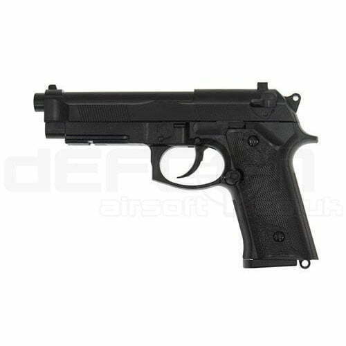 This is a great little sidearm at an absolute bargain price. A reproduction of the 9mm pistol (M9) this is a superbly well constructed weapon with an excellent comfort feel and remarkably accurate and powerful shot. Due to the fact that this is NON blowback, this weapon is extremely gas-efficient allowing more shots than a blowback pistol would from a single fill of green gas.