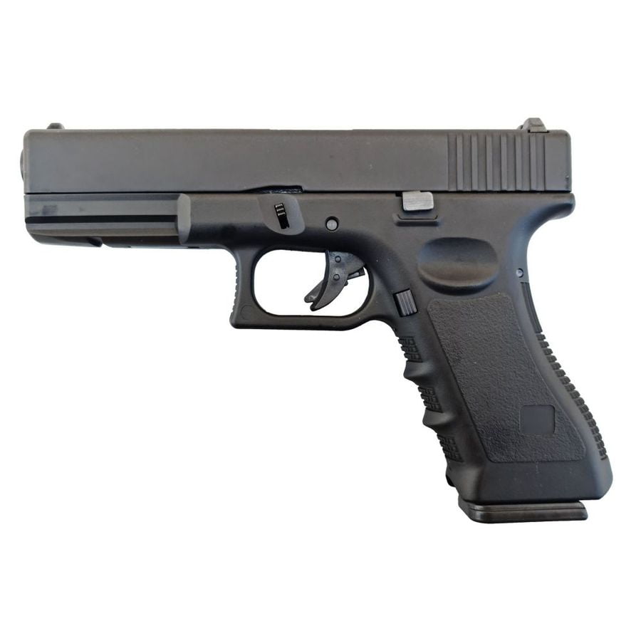 The Huntsman Tactical H17 Gas Blowback Pistol features a robust metal slide and a durable polymer body. This gas-powered model presents a reliable sidearm for airsoft players. The pistol includes essential features such as a functioning safety mechanism and both front and rear sights.