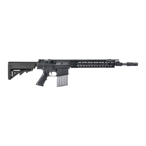 British forces operating in complex environments like Iraq and Afghanistan identified the shortcomings of traditional sniper systems in dynamic combat zones. Fixed-stock bolt actions proved unwieldy during urban patrols and close-quarter manoeuvres. As a direct response, the SR-25 ECC was developed to retain precision while improving manoeuvrability through a shorter 16” barrel and collapsible stock, making it an ideal multi-role marksman rifle chambered in 7.62x51mm.
