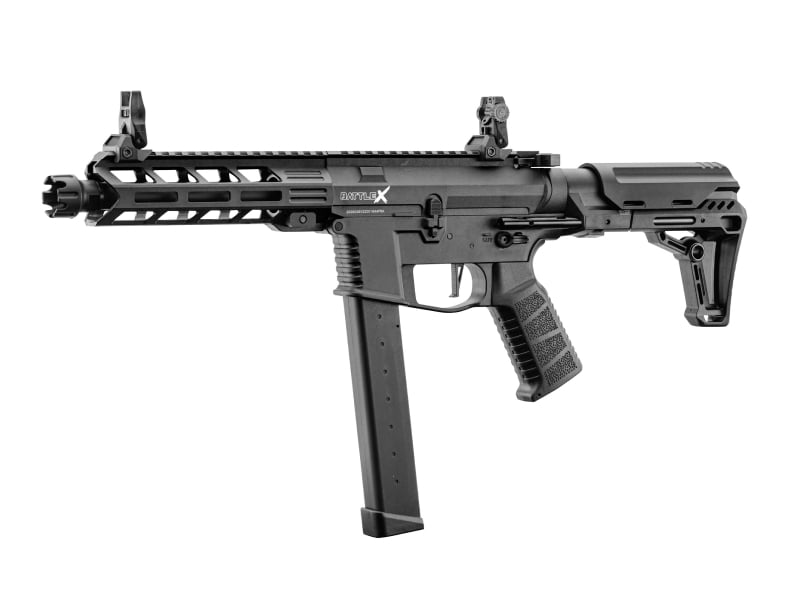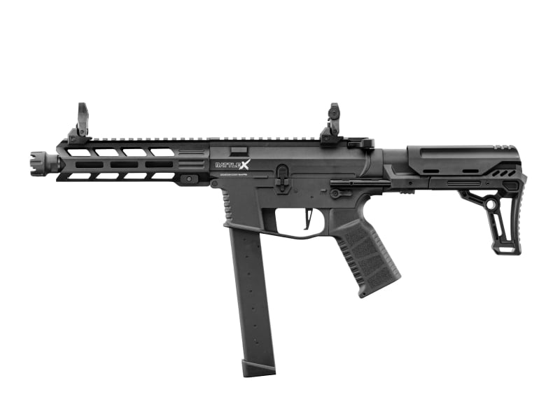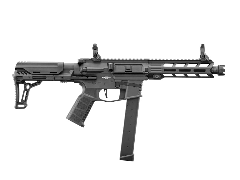 The Lancer Tactical LT-35 Gen2 9mm Battle X PDW in black offers a unique design tailored for airsoft enthusiasts. This model features the same internal technology as Lancer Tactical’s renowned AEG series, ensuring reliable performance. The compact and lightweight construction closely resembles a traditional M4, yet it accommodates 9mm magazines, providing versatility in magazine selection.