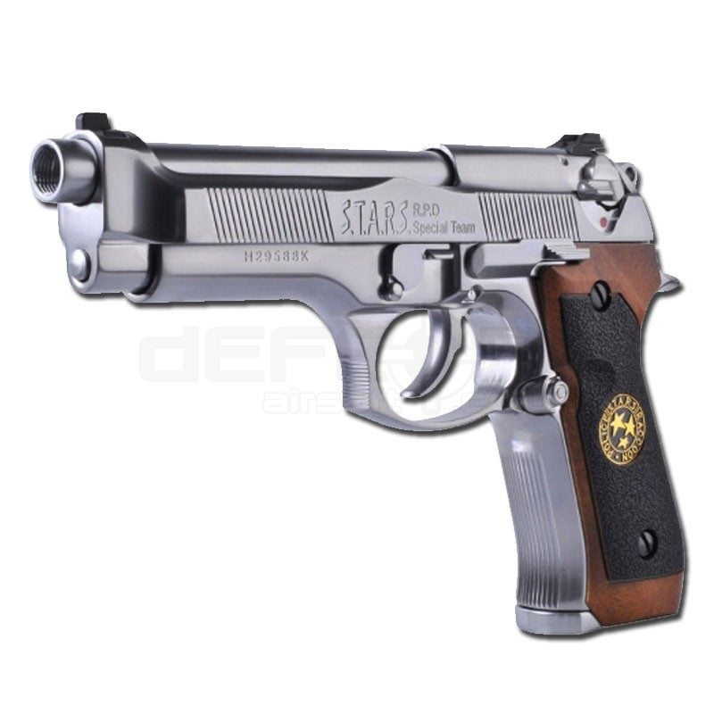 The Full Metal WE M92 Biohazard is based on the real steel M92 but also features ‘Racoon City Police’ trademarks giving the gun a truly amazing look for Resident Evil fans – the pistol grip bear the S.T.A.R.S. (Special Tactics And Rescue Service ) markings, a fictional special task unit of the Raccoon City Police Department known from the Resident Evil games series . The level of attention and detail of this pistol is reflected in its stunning design and flawless operation. It features sharp, crisp recoil and is extremely accurate.