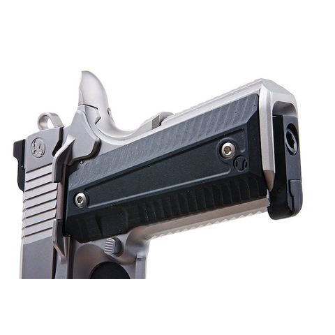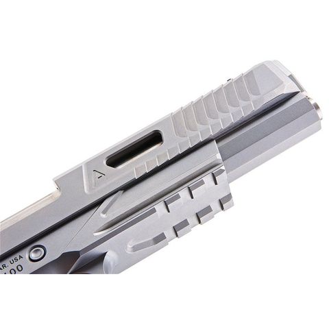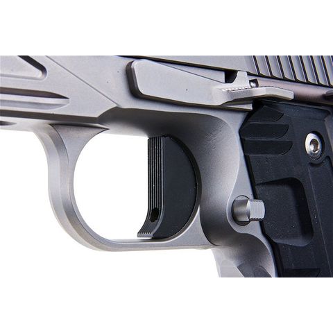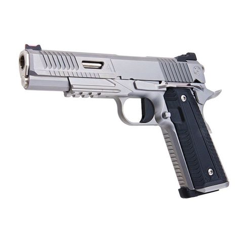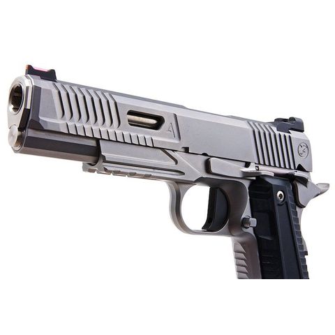 Its stainless finish, Agency Arms serrations, and RailScales grips create a striking tactical design. As a consequence of its reinforced internals and solid steel frame, this 1911 replica produces the hardest recoil of any production airsoft pistol.