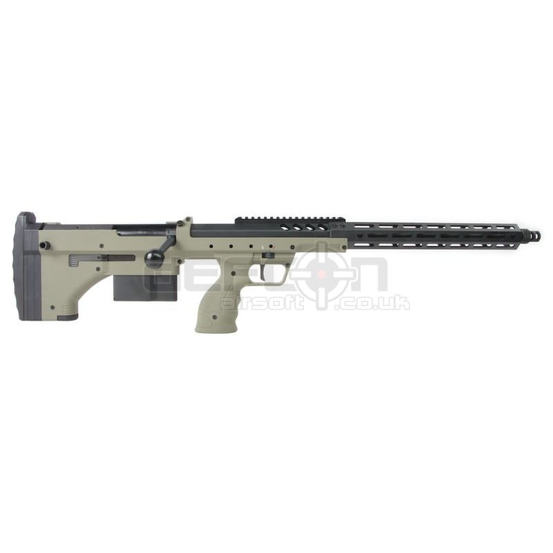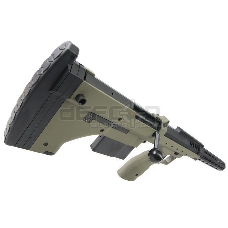 The Silverback SRS A2/M2 (22 inch Barrel) Licensed by Desert Tech in OD is a sophisticated bullpup sniper rifle. This model features a monolithic receiver crafted from aeronautical grade aluminium, ensuring strength and durability.