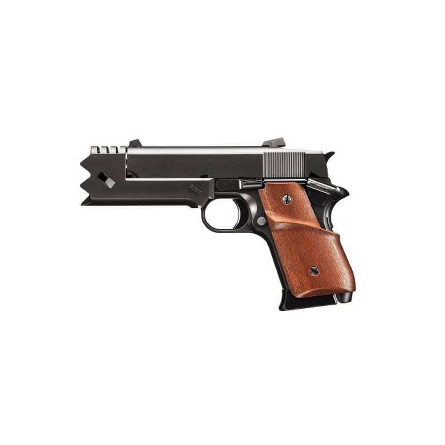Integrated strike compensator: The front strike face forms part of the slide assembly; thus the pistol maintains the distinctive tactical styling seen in the anime.