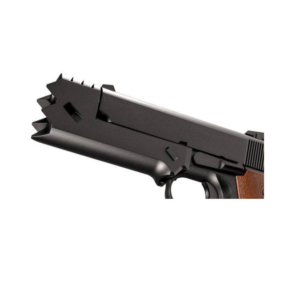 A distinctive strike-face integrated compensator sits at the front of the slide. This design element improves the visual profile and reinforces the anime-accurate appearance, therefore the pistol immediately stands out within any airsoft collection.