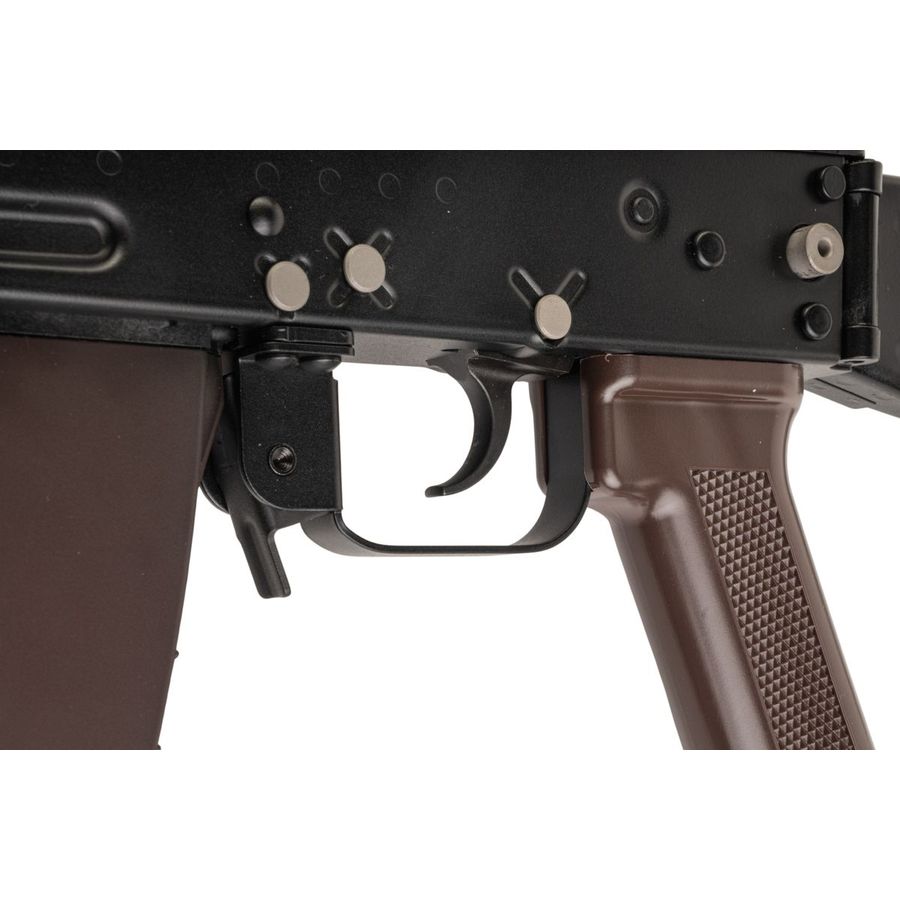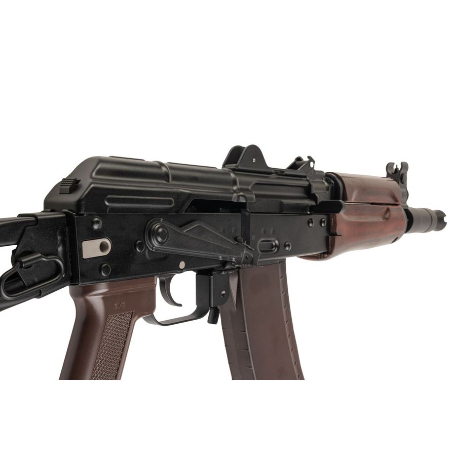 Modelled after the legendary AKS-74U developed by Mikhail Kalashnikov, this AVS74U gas blowback rifle bridges compact CQB handling with rifle-calibre aesthetics. Since the external assembly matches real steel specifications, genuine AKS-74U furniture and accessories can be fitted with minimal modification.