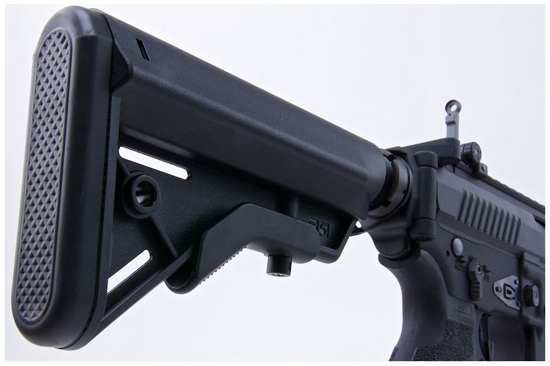 VFC Gladius DX, comes with full metal body and high quality Avalon engravings. The extendable Crane stock allows you to adjust the length of rifle to fits your body! Comes with a 120 round KAC Style Mid capacity magazine. Metal flash hider can be screwed off for installation of a 14mm clockwise threaded silencer, just like the Marui M4A1. Dust cover can be flipped open to reveal hop-up adjuster. Ambi Selector and Mag Release as standard..