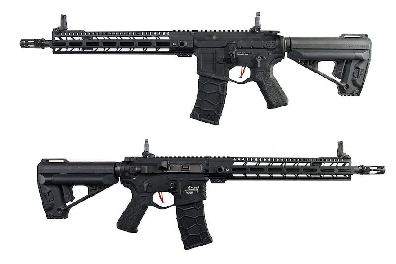 The VFC Samurai Edge is the latest AEG coming from VFC. Externally the gun is designed beautifully and in conjunction with the eye catching receiver sets, the gun comes with a fluted outer barrel and a slimline designed M-Lok compatible rail with sufficient picatinny rail slots on the 12 o’clock position up front for mounting lights or lasers. The Samurai Edge features the VFC designed QRS Stock and uses the same series magazines giving it a modern and sleek look. As a final touch, the gun shows off a red “lightening” trigger.