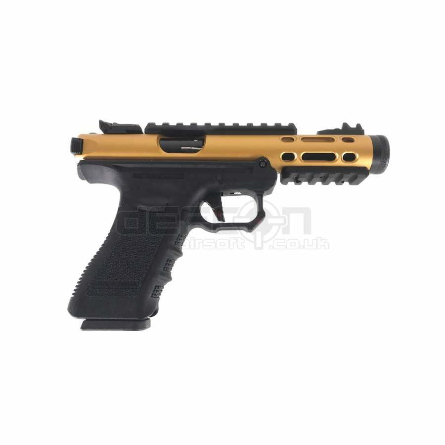 The WE Galaxy G-Series GBB Pistol in Gold offers a compelling blend of aesthetics and functionality. This pistol showcases a sleek design reminiscent of popular models like Ruger and Glock. Crafted from aluminium alloy and fibre reinforced polymer, it ensures durability.